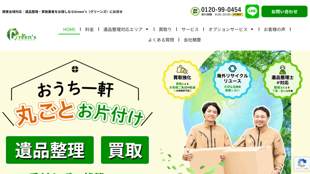 「グリーンズ株式会社」は、東京都福生市に拠点を置く、遺品整理・不用品回収・生前整理・ゴミ屋敷清掃などを手がける業者です。遺品整理には仕分け・搬出・処分・買取査定を含むワンストップ対応を標榜。関東全域を主な対応エリアとし、きめ細かなサービスと誠実な対応を売りにしています。