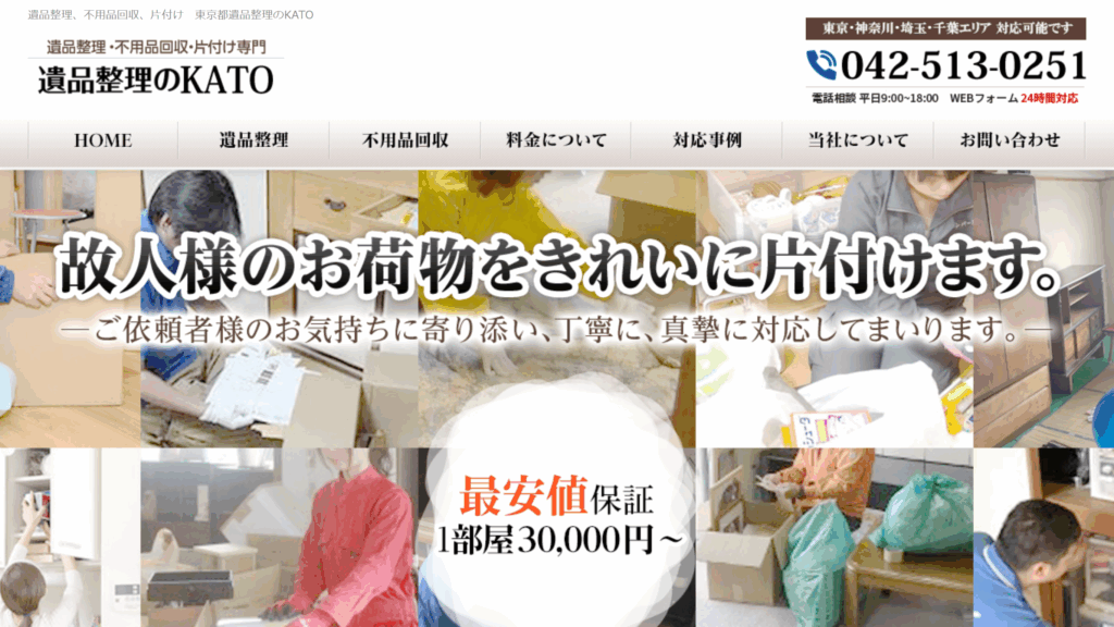 「遺品整理のKATO」は、東京都を拠点に、遺品整理・生前整理・不用品回収を手がける専門業者です。遺品整理士資格を持つスタッフが在籍しており、遺族の心情に配慮した丁寧な対応を重視。現地見積もりは無料で、仕分けから搬出・清掃までワンストップで対応できる点が特徴です。
