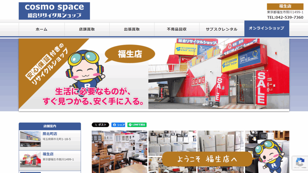 「コスモスペース福生店」は、福生市を拠点に、不用品回収・粗大ゴミ処分・遺品整理と出張買取を一体で行うリユース型業者です。地域巡回サービスを展開しており、借り置き拠点が近いため出張費を抑えられる可能性があります。また、回収後は店舗販売・海外再流通を通して資源循環に貢献している点をアピールしており、環境配慮型の整理を希望する人にも選ばれやすい業者です。