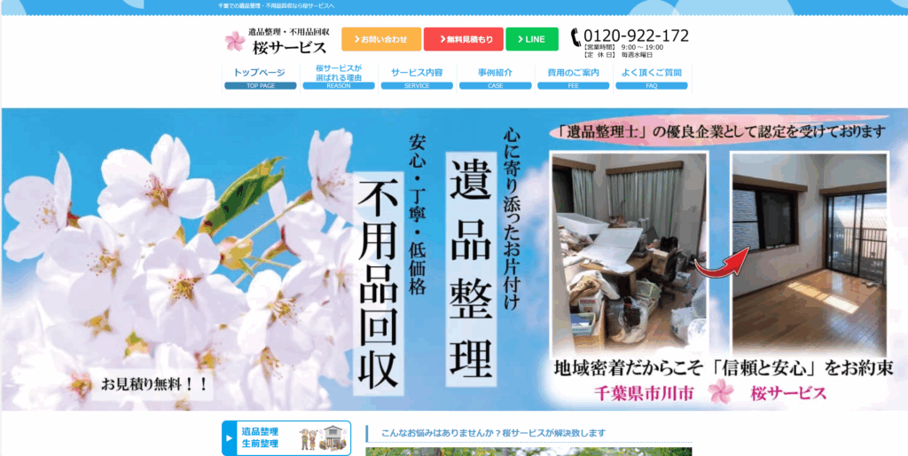 桜サービスは、市川市を拠点に、遺品整理、生前整理、特殊清掃などを専門に行う事業者です。不用品回収を伴う整理作業を得意としており、ご依頼者様の気持ちに寄り添った丁寧な作業を心がけています。