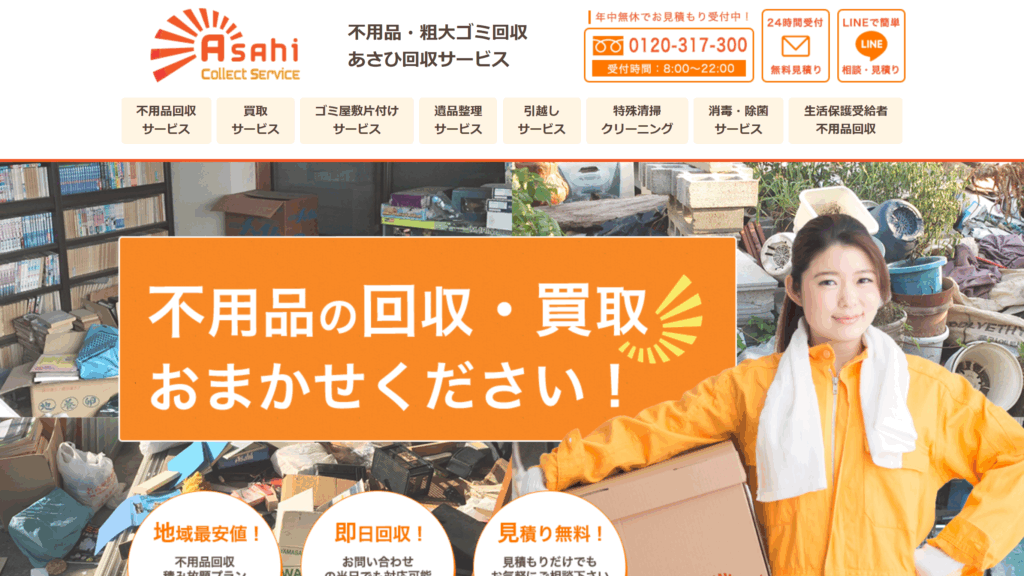 「あさひ回収サービス」は、東京都世田谷区を拠点に不用品回収・ごみ屋敷清掃・遺品整理などを行っています。特徴として「業界最安値に挑戦」「即日対応可能」「明瞭会計」「追加費用なし」の方針を掲げており、見積もり後の価格変動リスクを抑えようという姿勢が見られます。回収対象は個人家庭からゴミ屋敷まで幅広く、東京都・横浜・町田などを主な対応エリアとしています。