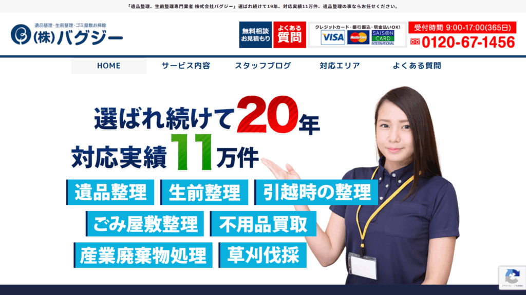 「株式会社バグシー」は、東京都町田市を拠点に、遺品整理・生前整理・不用品回収・買取・引越し整理などを手がける業者です。製造年5年以内の家電や家具については買取対応を行っており、見積もり時に差し引く形でコスト削減を図ることが可能。また、電話見積もり・現地見積もりが無料で、産業廃棄物収集運搬の許可も保有しているため、法人案件や大量処分にも対応力があります。