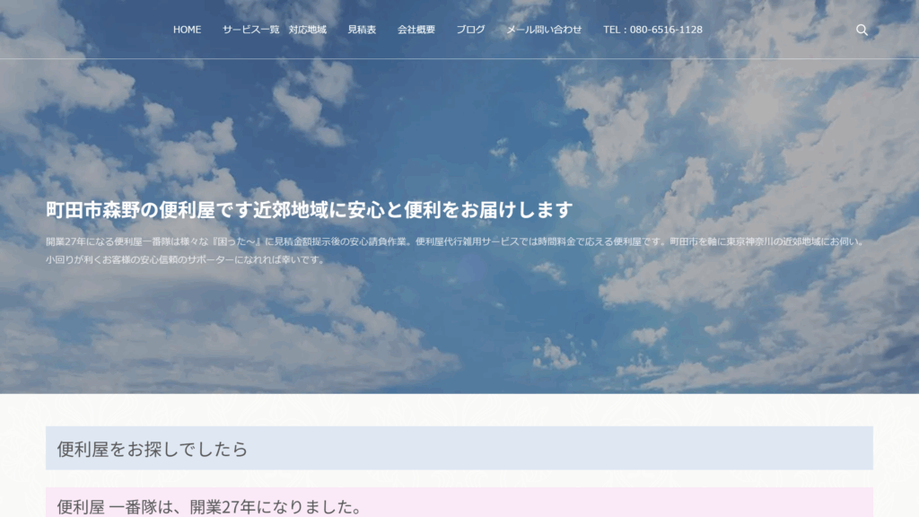 「便利屋 一番隊」は、町田市を拠点に、開業27年の実績を持つ地域密着型の便利屋です。「見積もり相談無料」「作業前に金額提示」「追加料金なし」を明示しており、依頼者にとって安心感のある対応を掲げています。サービス内容は不用品回収・掃除・運搬・家具設置・庭の片付けなど多岐にわたり、生活の「困った」を幅広くサポート。