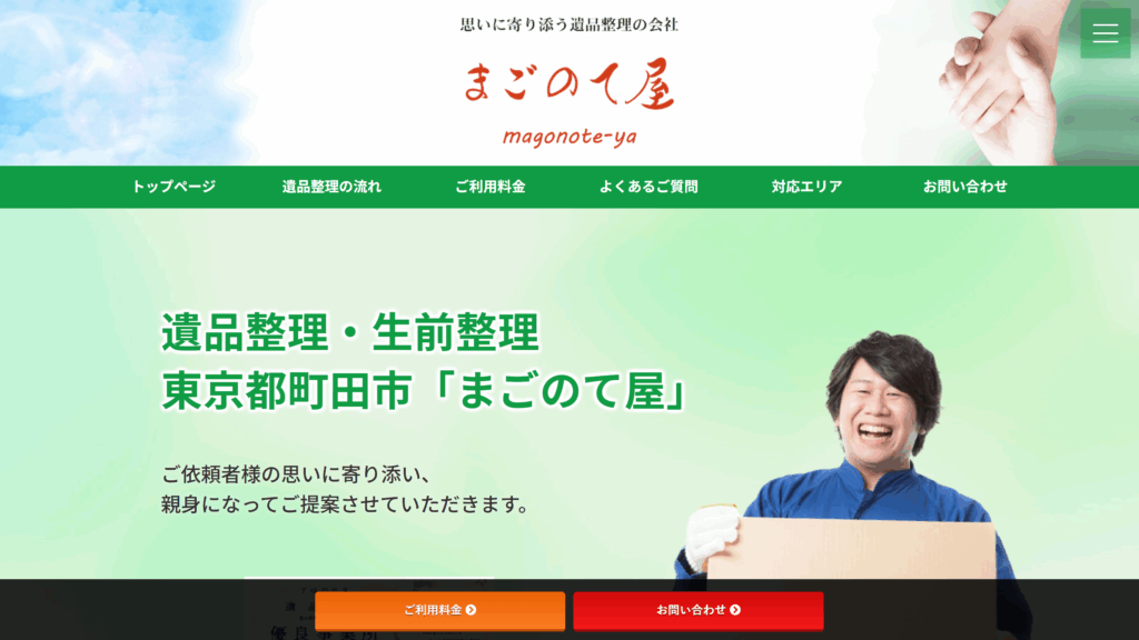 「遺品整理「まごのて屋」」は、東京都を中心に、遺品整理・生前整理・特殊清掃・不用品回収を行う専門業者です。遺品整理士の資格を持つスタッフが在籍しており、遺族への配慮を重視した丁寧な対応が特徴。現地見積もりは無料で、費用の内訳も明確に説明してくれるため安心感があります。遺品の仕分けや貴重品探索にも対応しており、単なる回収ではなく“心の整理”をサポートする姿勢が評価されています。