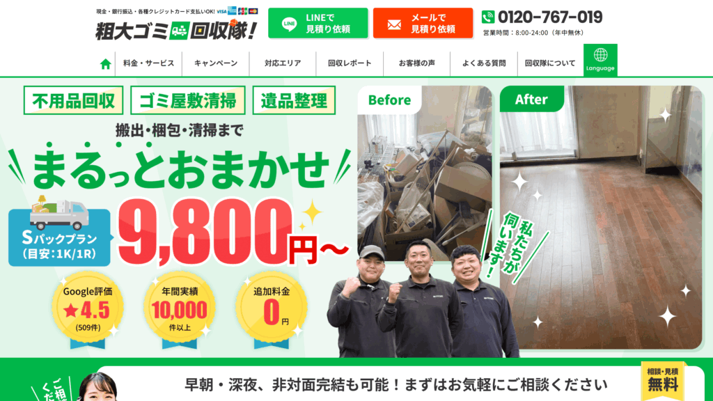 「粗大ゴミ回収隊!」は、法的に必要な許認可を取得して、各都道府県で適切な処分を行う体制を整えている業者です。不用品・粗大ゴミの回収だけでなく、ゴミ屋敷の清掃や引越し時の不用品処分など幅広く対応。受付時間が長く、24時間対応をうたっているエリアもあり、急な依頼にも応じやすい点が強み。さらに、見積もり後の追加料金なしを公言しており、料金の透明性にも配慮している印象です。