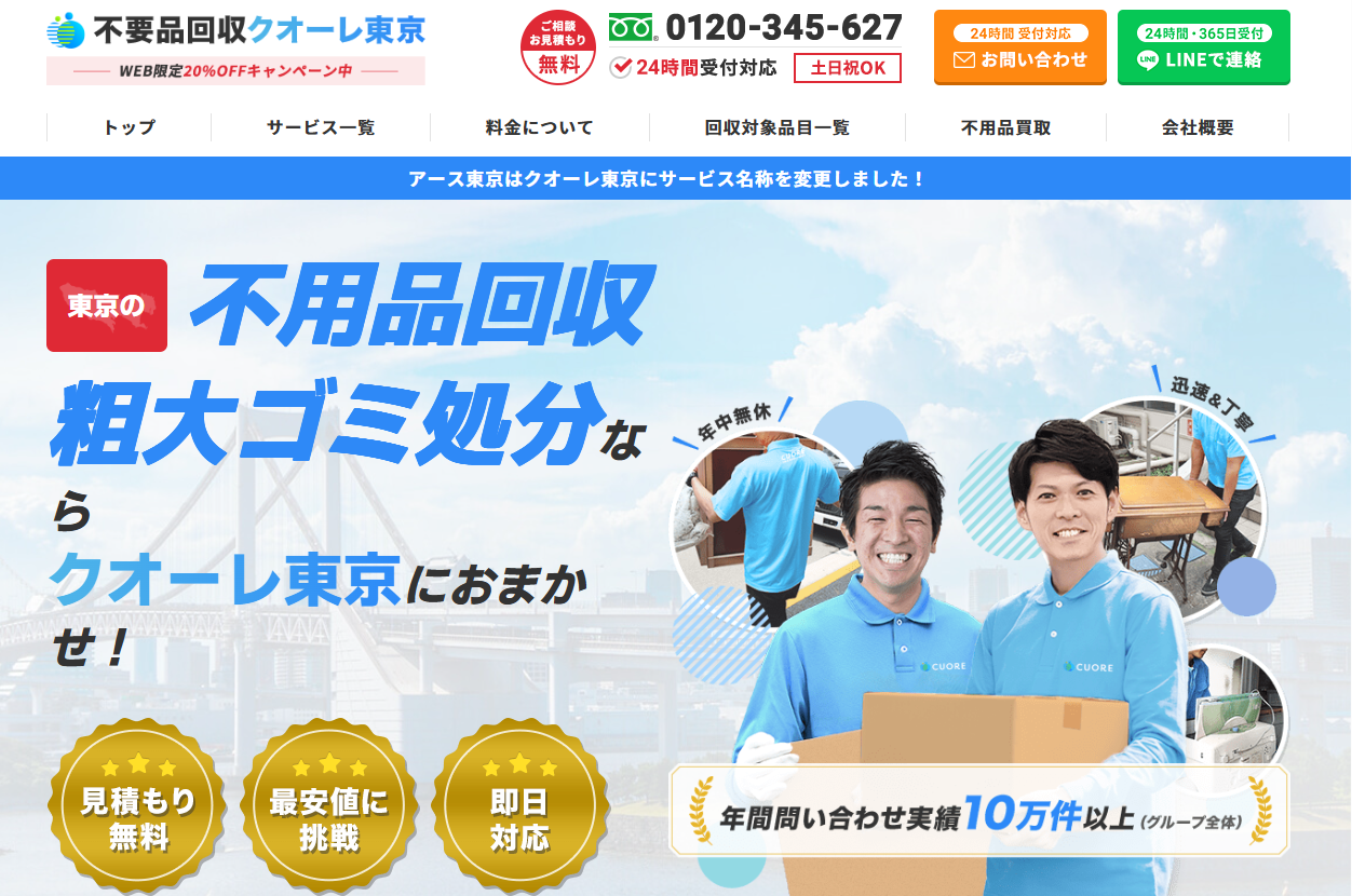 不用品回収クオーレ東京は、無料相談・見積もりから最短即日対応まで、お客様のニーズに迅速に応える不用品回収業者です。少量から家一軒まるごと、事業系ゴミまで幅広く対応し、面倒な分別も不要。公式サイトからの問い合わせでWEB限定20%OFFキャンペーンも利用でき、追加料金なしの明朗会計が魅力です。回収品の約80%を再利用する環境に配慮した取り組みも行っています。
