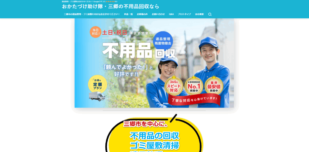 おかたづけ助け隊は、三郷市を拠点に、不用品回収、ゴミ屋敷の片付け、遺品整理、生前整理などを専門に行う事業者です。最短即日での対応も可能で、急な片付けのニーズにも柔軟に対応します。見積もりは無料で、追加料金が発生しない安心の明朗会計を掲げています。