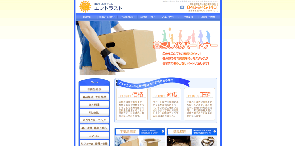 見積もりは無料で、業界最安値に挑戦することを掲げており、他社より高い場合は相談可能です。年中無休で対応しています。
