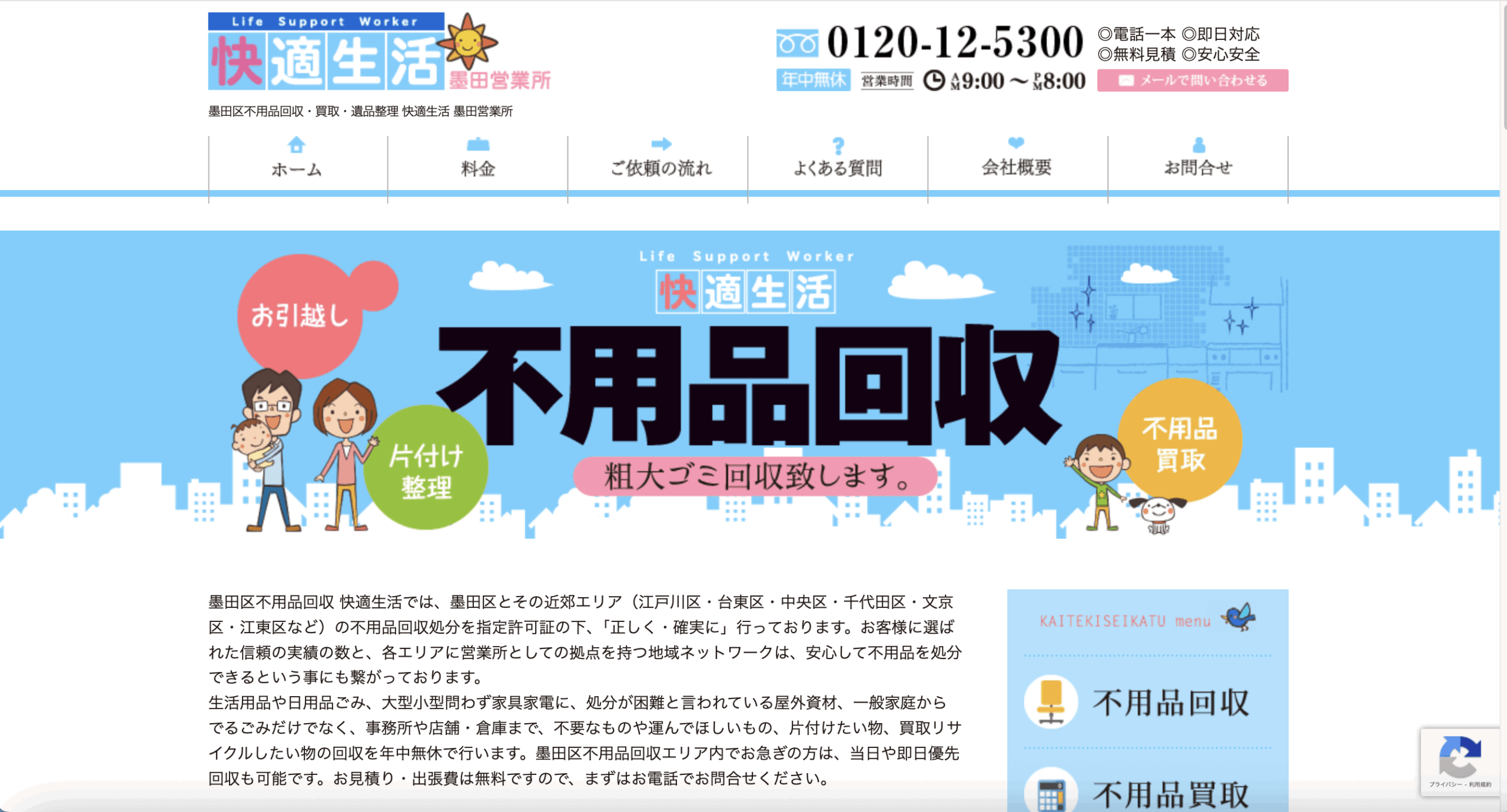 快適生活 墨田営業所は、即日対応と幅広い対応力が強みの不用品回収業者です。年中無休で営業しており、墨田区エリア内でのお急ぎの依頼に対しては、当日や即日優先回収が可能です。