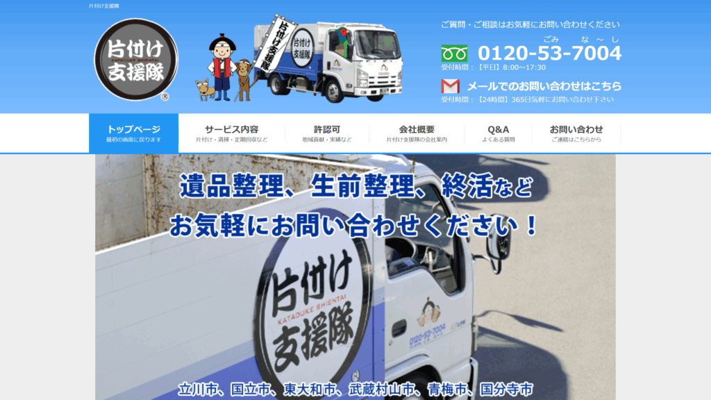 「片付け支援隊」は、東京都立川市を拠点とし、不用品回収・遺品整理・ゴミ屋敷清掃・空き家片付けなどを手掛ける地域密着業者です。乗用車1台分からトラック積載まで対応可能とされ、回収量に合わせた柔軟なサービス体制が特徴。見積もりは無料で、対応エリアを関東全域に拡大しているという点も利用しやすさの要素。