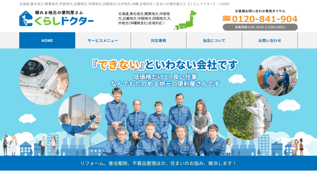 「くらしドクター」は、東京・埼玉・神奈川をはじめ全国展開の便利屋で、不用品整理や遺品整理、引越し・リフォームなど住まいの幅広い困りごとに対応しています。不用品整理では「最短即日対応」「夜間作業可」「清掃・現状回復まで含めて対応可能」など柔軟性を重視。また、買取サービスも扱い、捨てるだけでなく価値を活かした処分を目指す姿勢も特徴です。