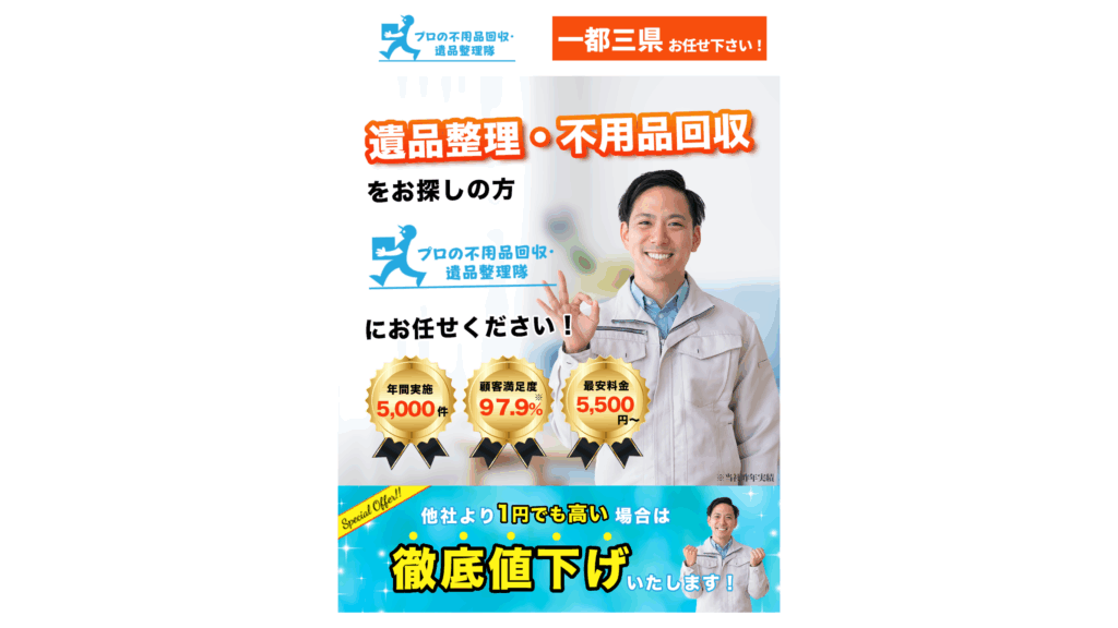 「プロの不用品回収・遺品整理隊」は、関東エリアを中心に、不用品回収・遺品整理を手がける業者です。見積もりは無料で、納得できるまで相見積もり対応を謳っており、料金面の透明性を重視しています。また、夜間や早朝の作業も相談可能で、急ぎの依頼にも柔軟に対応してくれる点が強みです。