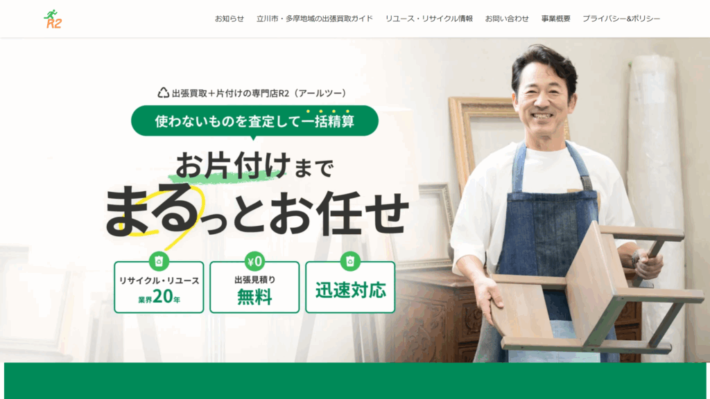 「R2(アールツー)」は、立川市を中心に、不用品回収・買取・遺品整理・引越しサポートを手がける業者です。古物商許可を持ち、通常の回収だけでなく「買い取り可能な家具・家電」を査定・買取することで、処分コストを抑えるスタイルを採っています。また、専門スタッフによる対応や家一軒まとめての片付けにも対応可能と紹介されており、多様なニーズに応じられる体制が魅力です。
