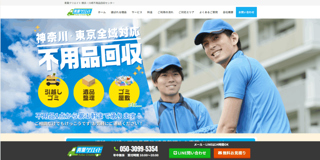 青葉クリエイトは、横浜・川崎を中心に、不用品回収、不用品買取、遺品整理、生前整理などを行う事業者です。日用品から大型家具・家電、楽器まで、幅広い不用品の回収に対応しています。