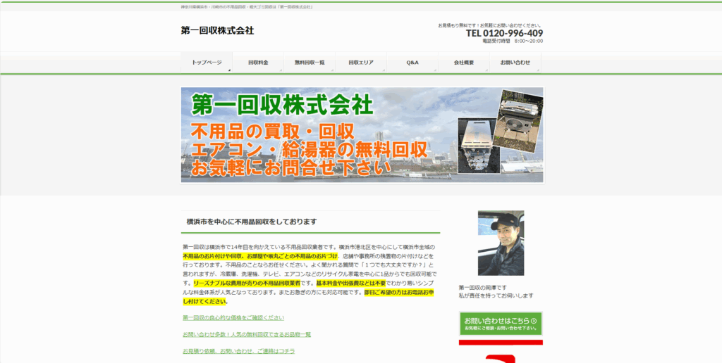 第一回収株式会社は、横浜市全域および東京・神奈川を対応エリアとする不用品回収業者です。10年の実績があり、不用品回収のほか、ゴミ屋敷の掃除、遺品整理、事業ゴミの回収など幅広くサポートしています。