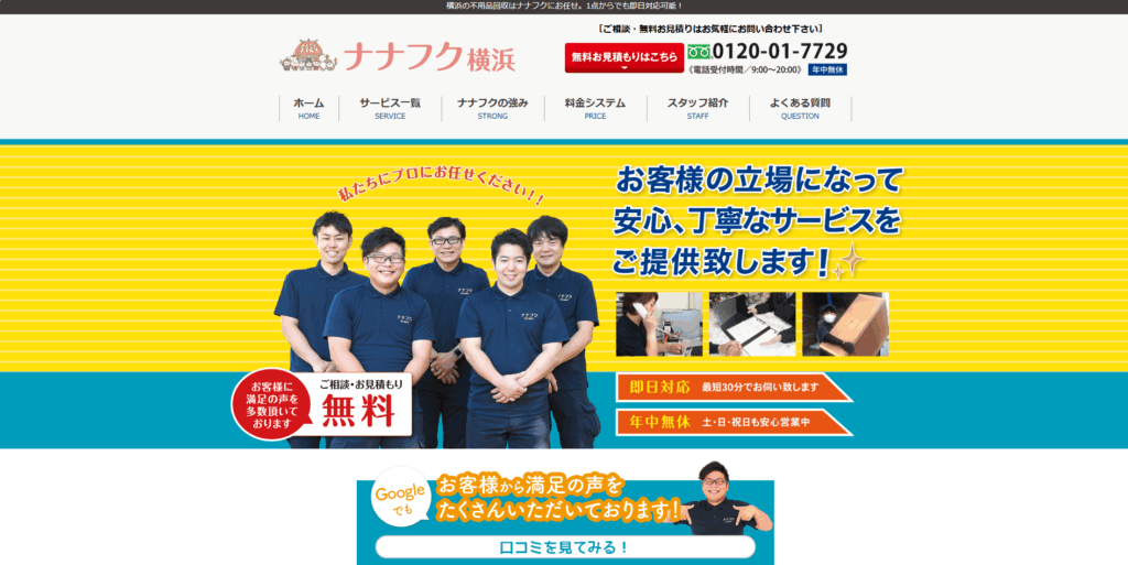 ナナフク横浜は、横浜で不用品回収、粗大ゴミ、遺品整理、買取などを行うリサイクル業者です。「おかたづけ」と「買い取り」に強みがあり、独自の海外販売ルートを構築することで、他社にはない買取ジャンルを扱い、業界最安値を目指しています。