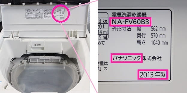 縦型洗濯機は、フタの左下と右上、もしくはフタの裏に記載があります。